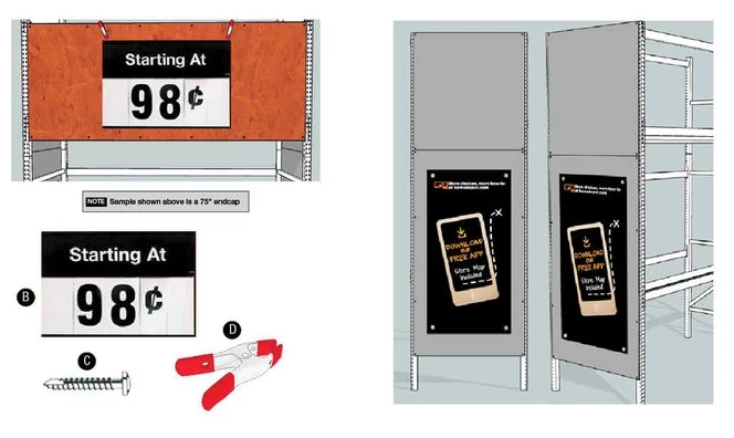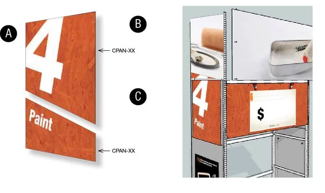 Inside the store, not all holiday items could fit into the holiday section and had to be located in different locations around the store. An Easy Find Bay Identifier System was the result. This visual system directed customers to additional holiday inventory and provided important visual cues, such as the tree height chart, allowing shoppers to plan and purchase their ideal holiday home purchases.